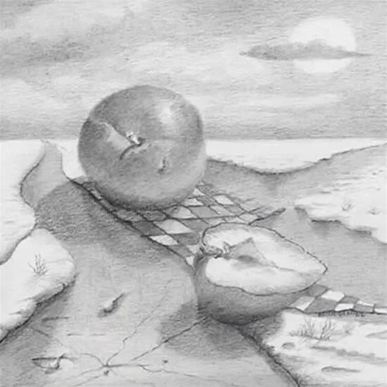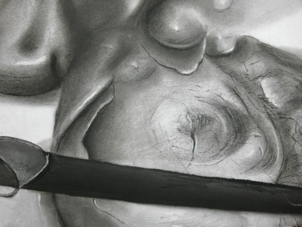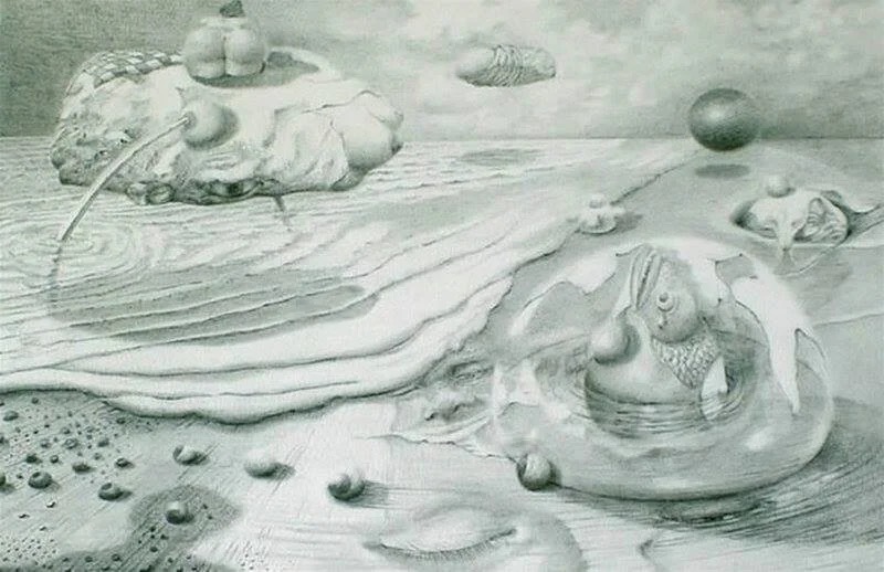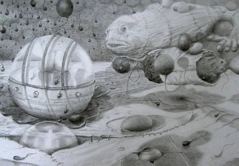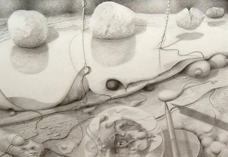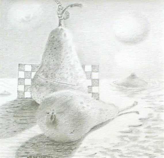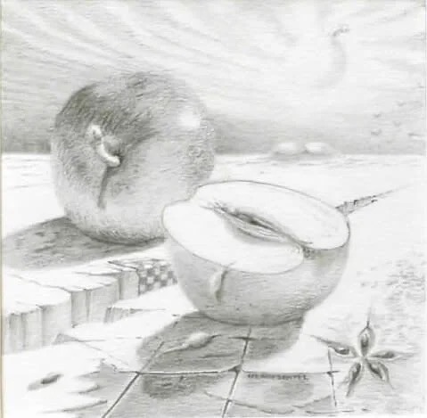 Getoonde tekeningen zijn gemaakt vanuit verschillende perioden en zijn gekoppeld aan het thema ‘evolutie’, de vier tekeningen waar fruitsoorten als symbolen gebruikt worden, zijn ook voorstudies voor olieverfschilderijen. De ‘imaginaire’ surrealistische verbeeldingen zijn ontstaan vanuit het idee om met verschillende hardheden tekenpotloden een ‘grafisch’ effect te bewerkstelligen, Ik heb hierin voornamelijk gewerkt met grafiet van het harde soort de H serie. Ook zien jullie tekeningen waarin gewerkt is met houtskool in combinatie met zachte grafiet, de B serie.